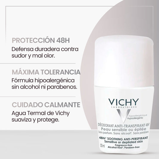 Vichy Antitranspirante Piel Sensible o Depilada 50ml es un desodorante antitranspirante de alta eficacia diseñado para brindar protección de hasta 48 horas contra el sudor y el mal olor, respetando las pieles más sensibles o recién depiladas. Su fórmula hipoalergénica está libre de alcohol y parabenos, enriquecida con Agua Termal...