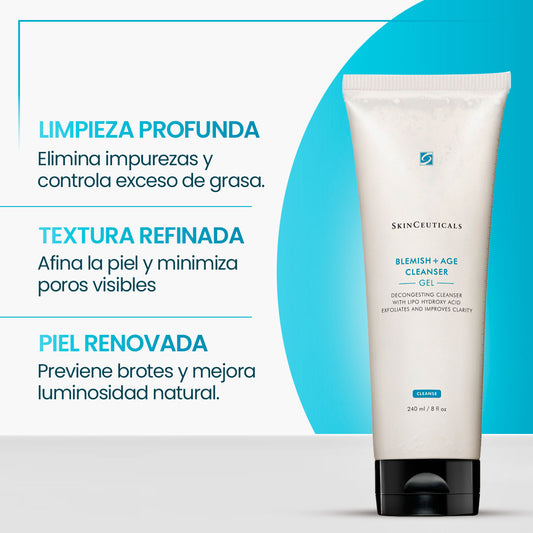 SkinCeuticals Blemish + Age Cleanser Gel 240ml es un gel limpiador exfoliante diseñado para piel grasa, mixta, con tendencia acneica o piel madura con imperfecciones. Su fórmula combina ácido glicólico, ácido salicílico y LHA, ofreciendo una acción purificante y exfoliante que elimina impurezas, reduce el exceso de sebo y afina...